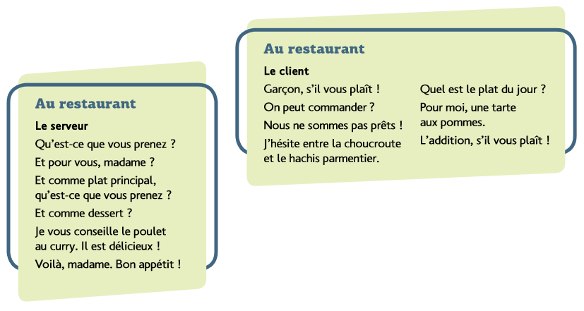 Tu es dans un resto français avec deux camarades. Deux choisissent le menu, le troisième joue le serveur.