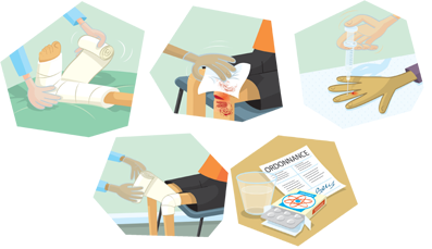 Où ont-ils mal ? Qu’est-ce qu’on leur a fait aux urgences ? Écris le bon numéro.